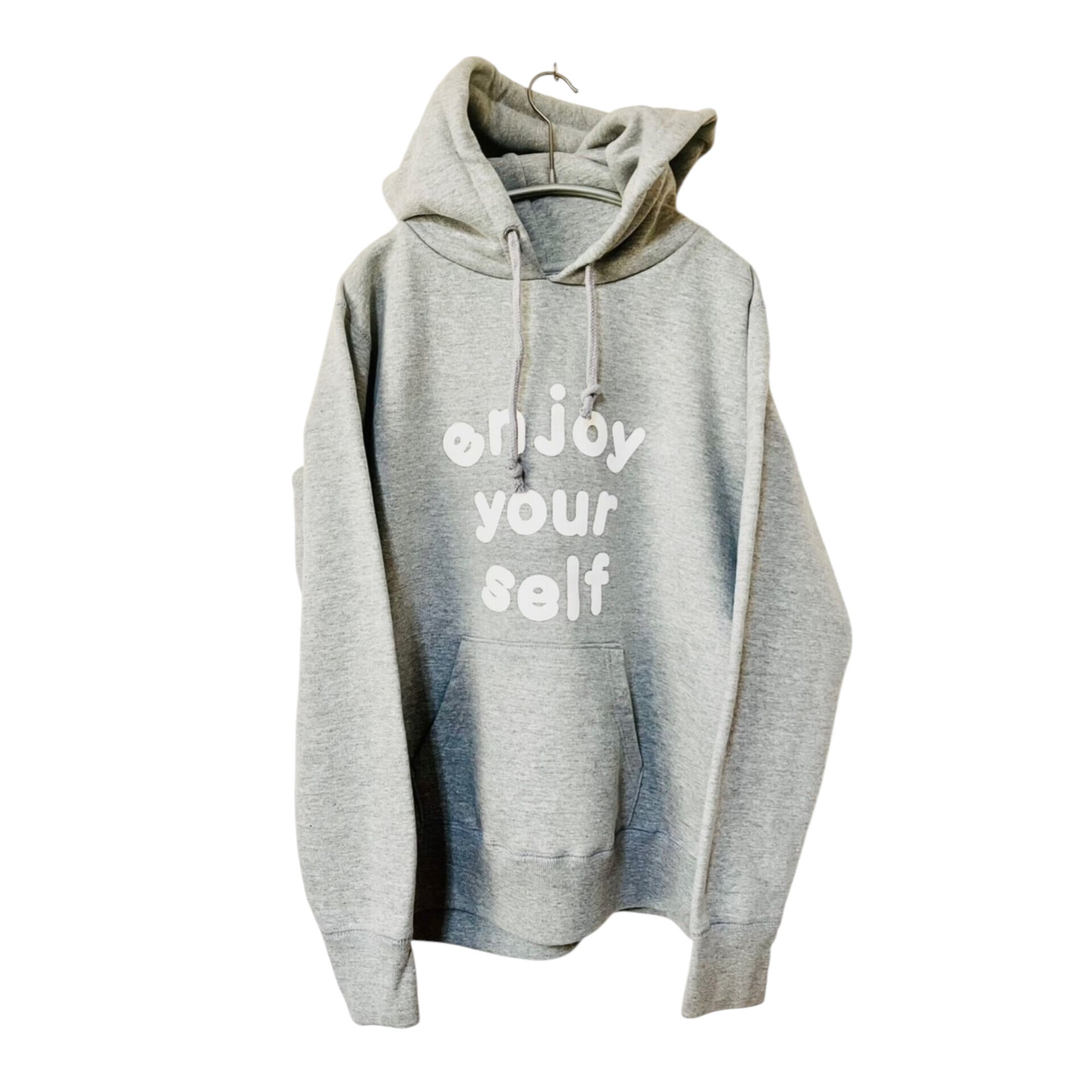 心地よい着心地とスタイルを兼ね備えた「enjoy your self hoodie」は、毎日のコーディネートを楽しくします。 こちらは、全3色展開のうちの一つ、杢グレー×白プリントです。